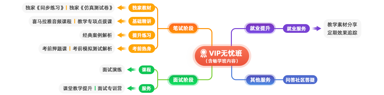 主要针对非相关专业的小白或者想转行,寻求多一条出路,那就选vip无忧班,其中的经典案例解析、考前模拟测试让学员可以了解到自己的学习情况,在课后辅以成块式的课程安排体系,让教学更为科学集中,学联并进,在保障各科学习效果提升的同时,兼具更强的指导意义。
